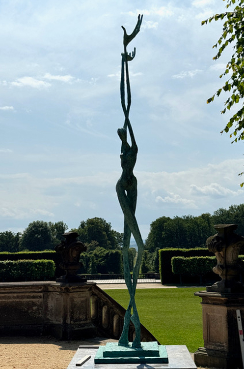 Dass Helge Leibergs Bilder und Plastiken hier in einem idealtypischen barocken Garten zu sehen sind, verweist auf ihren emblematischen, sinnbildhaften Charakter. Sie zeigen, was sie sind. Und sie bedeuten, was wir ihnen an Bedeutungen zumessen. Zu den Tätigkeiten des Zeichnens und Aufzeichnens tritt in den plastischen Arbeiten das Bezeichnen. Leibergs wie in den freien Raum gezeichnete Tänzerinnen bezeichnen den Raum als einen konkreten Ort. Die Emblematik, die ihre Hochzeit im Barock hatte, öffnete der Kunst neue Räume des Denkens.